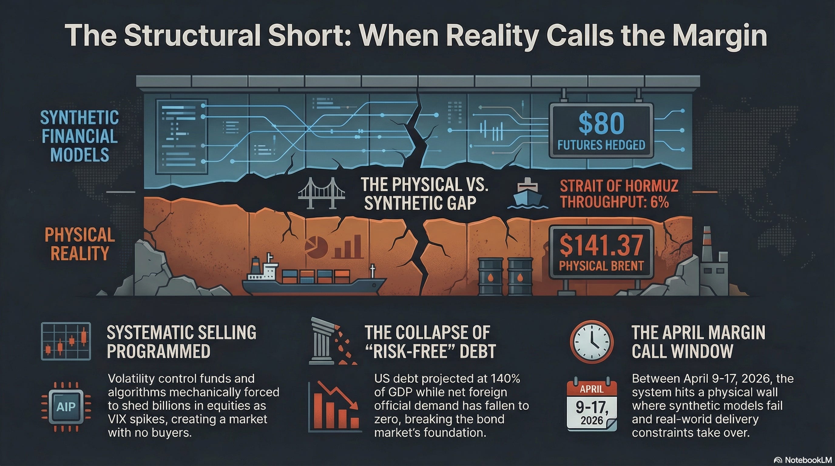 The system is short everything real and long everything synthetic. The margin call is the moment when the synthetic layer discovers that the real layer has moved, permanently, and the gap between them must close. The gap closes in one direction only. The synthetic layer reprices to the physical layer. The physical layer does not reprice to the synthetic one.