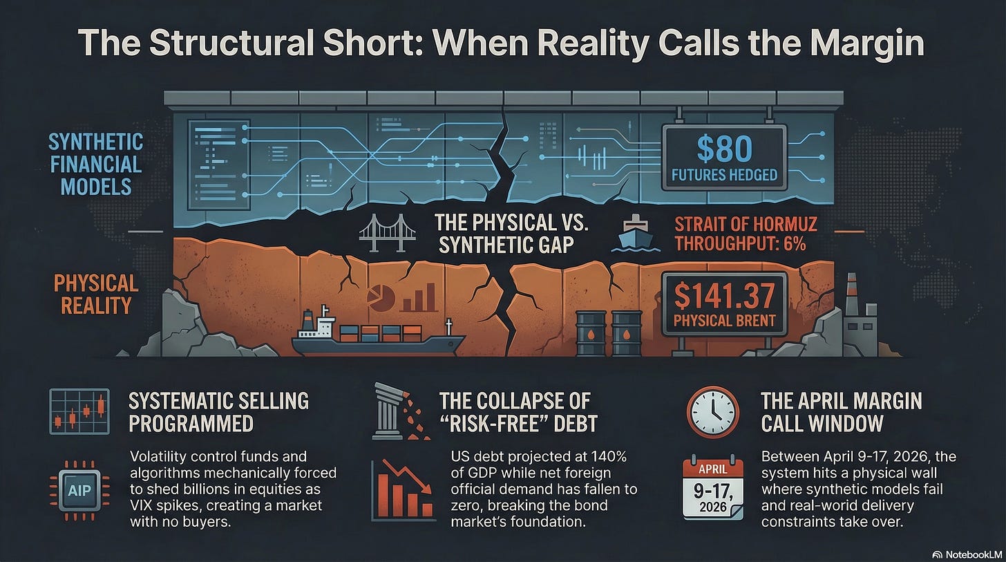 The global financial system is facing a margin call on all three shorts simultaneously. The commodity short is being squeezed by $141 physical crude against $109 futures. The volatility short is being squeezed by mechanical selling into a market with no mechanical bid. The bond short is being squeezed by supply surging into evaporating demand while quality degrades.